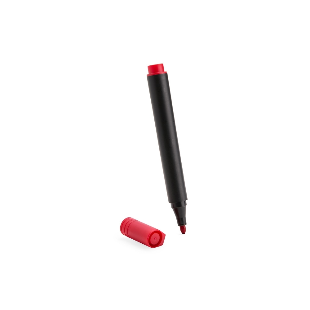 Caneta marcadora plástica com ponta em formato de pincel. Possui tinta atóxica à base de óleo com solvente alcoólico.